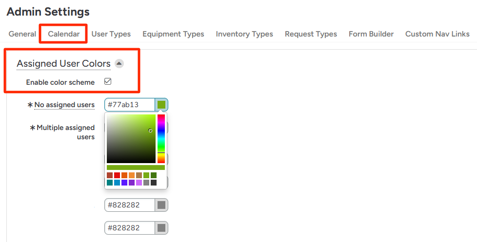 2. Click into the Calendar tab at the top of the page and then click into the Assigned User Colors section.