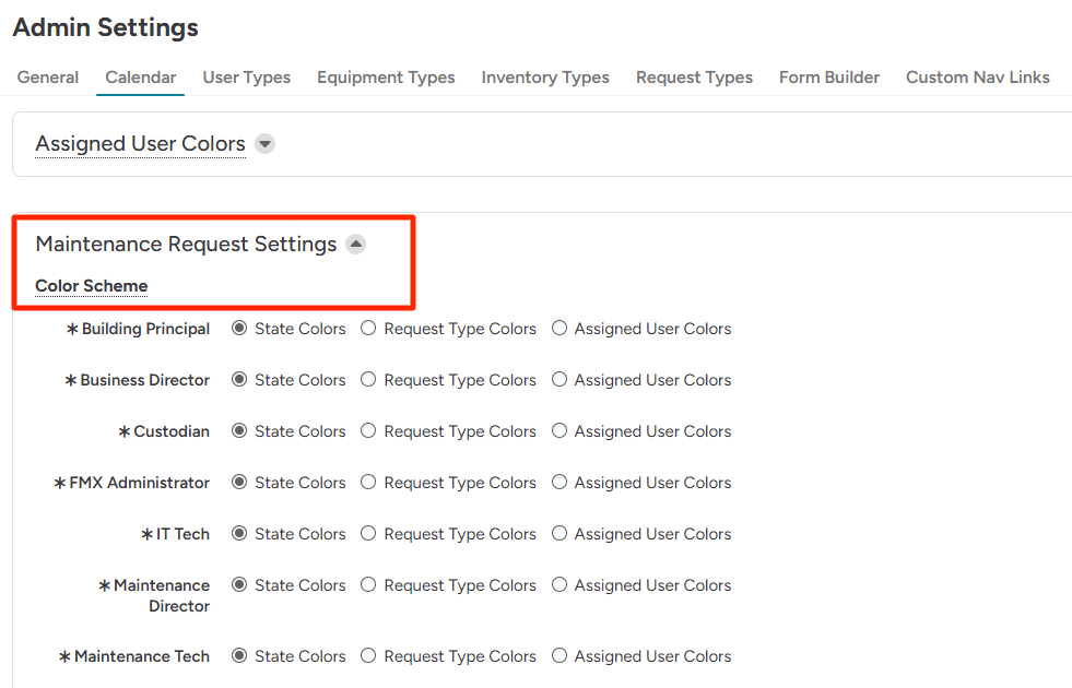 5. Here you can customize which user type will see which color scheme (Status of Request, Request Type, or Assigned User) for each module. If you would like all user types to view the calendar by the assigned user, select "Assigned User Colors" for each user type.