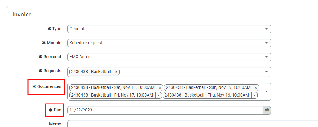 2. Select the occurrences you wish to invoice. Please note, if you do not select all of the occurrences the request will stay in the status "Pending Invoice". If you wish to invoice some occurrences now and the rest later, you will have the ability to invoice the remaining occurrences later. Select a due date for the invoice.