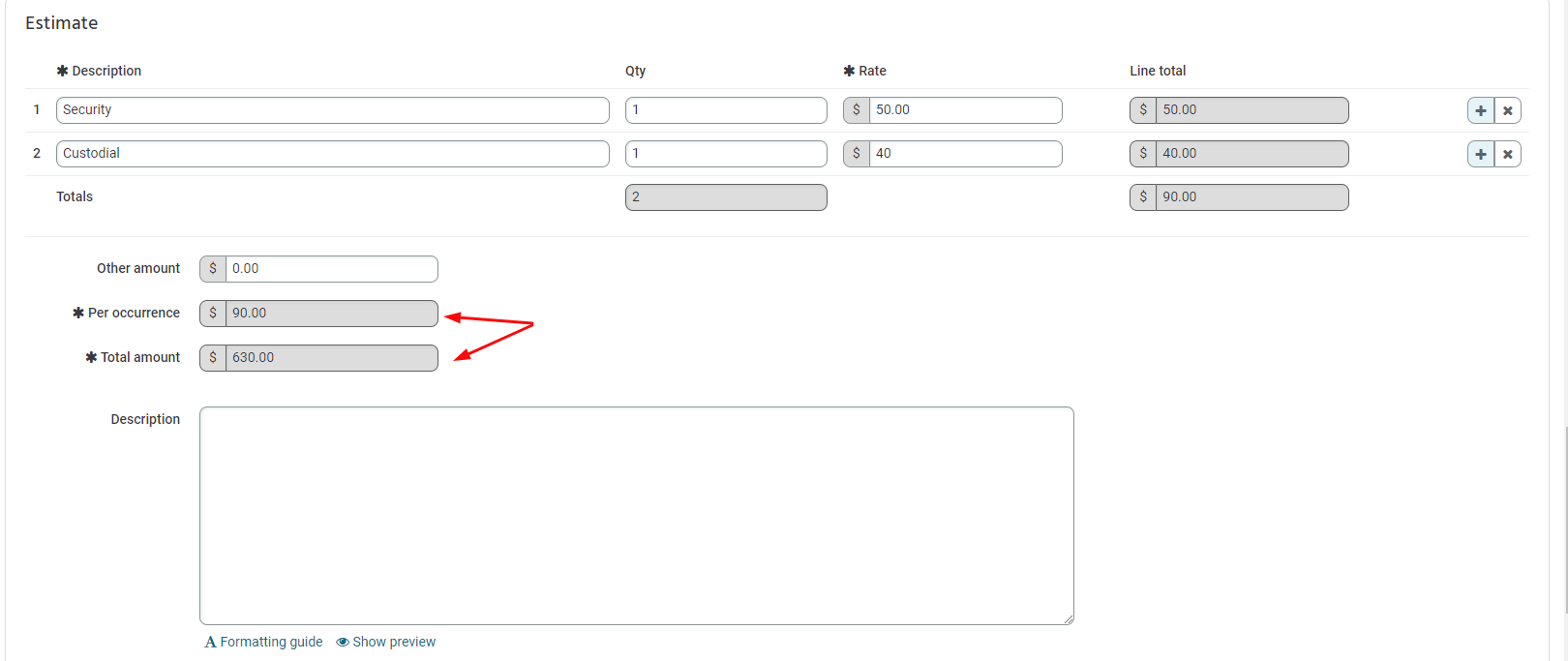 2. You can then enter multiple line item descriptions, their quantity, and their rate. These will then populate automatically in the line total. Additionally, there is an "other amount" and description text area of what the estimate includes. The estimate will show you what each occurrence will cost and the grand total.