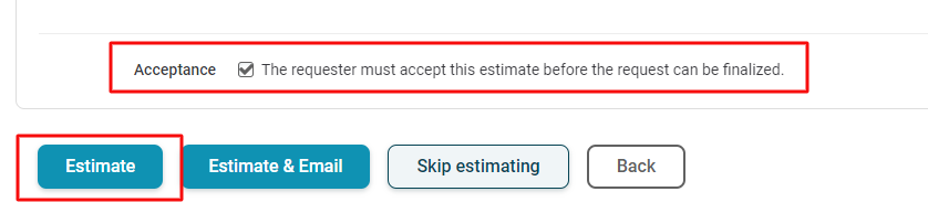 3. Click Estimate to send your estimate. This will generate an email notification to the requesting user asking them to confirm the estimate. If you do not want to have the user "accept" the estimate, please uncheck the "Acceptance" checkbox.