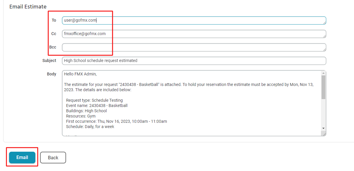 4. Click Estimate & Email to send your estimate to a separate email from the requester. This will allow you to edit and add email addresses in the "To," "CC," and "BCC" lines, including the subject and body of the email itself. To make changes, click in the box you'd like to edit. Then click "Email" to send the email.