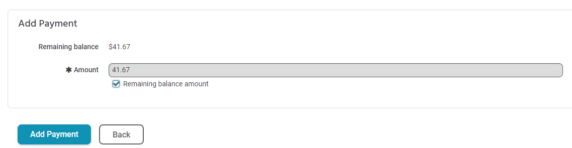 3. Enter the payment amount, or click the checkbox for “Remaining balance amount”, and click Add Payment.