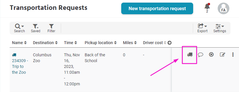 1. Find the transportation request you wish to assign (on the calendar or in the 'Transportation Requests' module accessed via the left sidebar).