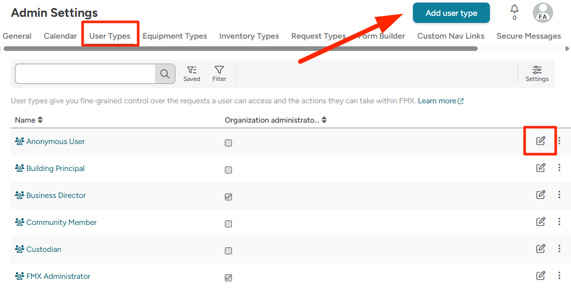 - Click Add User Type to create a new user type, or click on the details icon to edit permissions for an existing user type.
