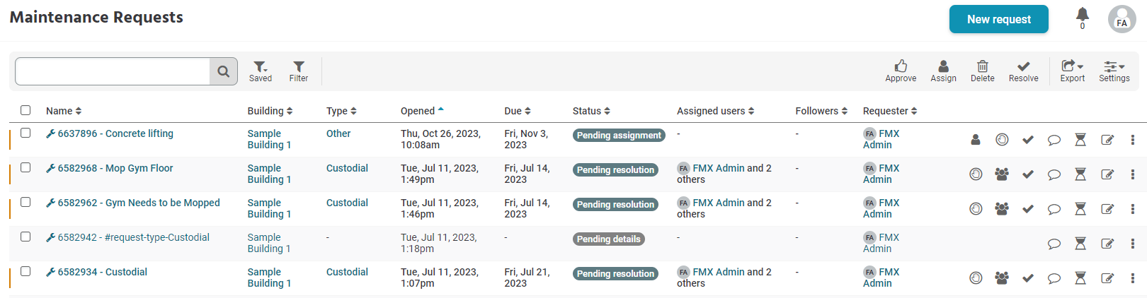 FMX offers several reporting options within the Maintenance Request module. A list of maintenance requests can be downloaded/exported from the grid view in the following formats: