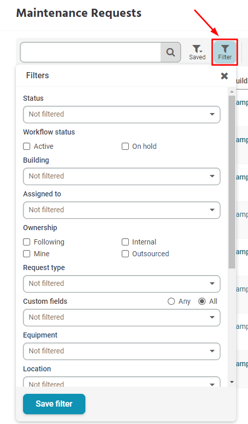 The most commonly used filters such as Status (Open, Completed, etc.), Building, and Assigned to (user the maintenance request is assigned to) are set at the top of the filter menu.