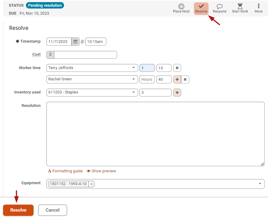 2. After clicking Resolve you can enter resolution notes, log worker time, any associated costs, equipment, and inventory used.