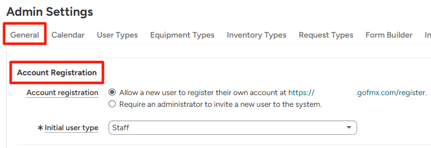 - Where it says Account registration check the radio button to Allow a new user to register their own account at yourcompany.gofmx.com/register and Select the Initial user type access.