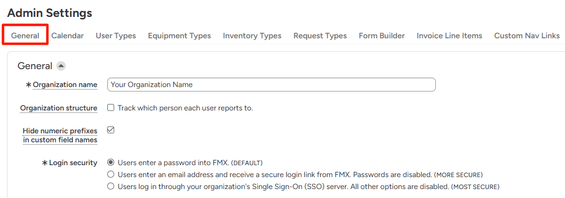 Your FMX account name appears on your FMX organization page and in email notifications. Your organization time zone should be set to accommodate the majority of your users. Admins and users can also change their time zone on an individual account level. To change your organization's settings: