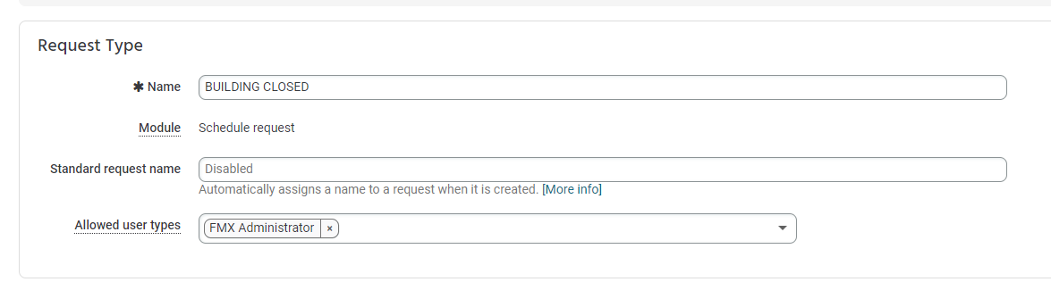 1. Create a request type titled "Building Closed" in your site's Admin Settings. Navigate to Admin Settings > Request Types > Add Request Type
