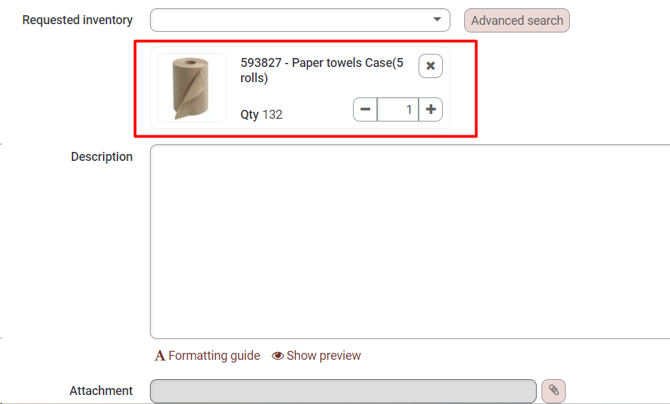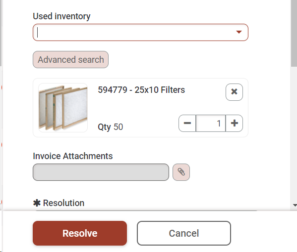 Each inventory item can have it's own image that will appear when inventory is requested, applied to a planned maintenance task or applied to a request by selecting the item from the drop down list. Once you select the item you would like you can then choose the quantity you would like by typing in the number field or clicking the plus sign.
