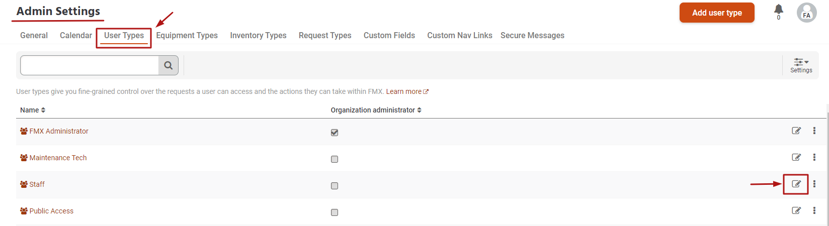 1 Start in Admin Settings, and click the "User Types" tab towards the top of your screen. Click "Edit" to the right of the line for the User Type that you'd like to require Liability Insurance.