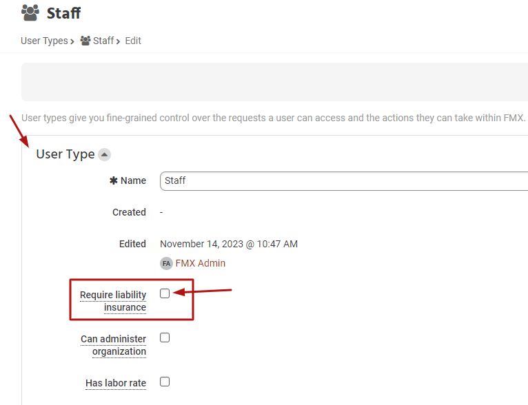 Now that we have set it so that this User Type requires Liability Insurance, we have to enter their insurance expiration date in their profile. Users will be able to submit Schedule Requests until the expiration date entered here has passed.