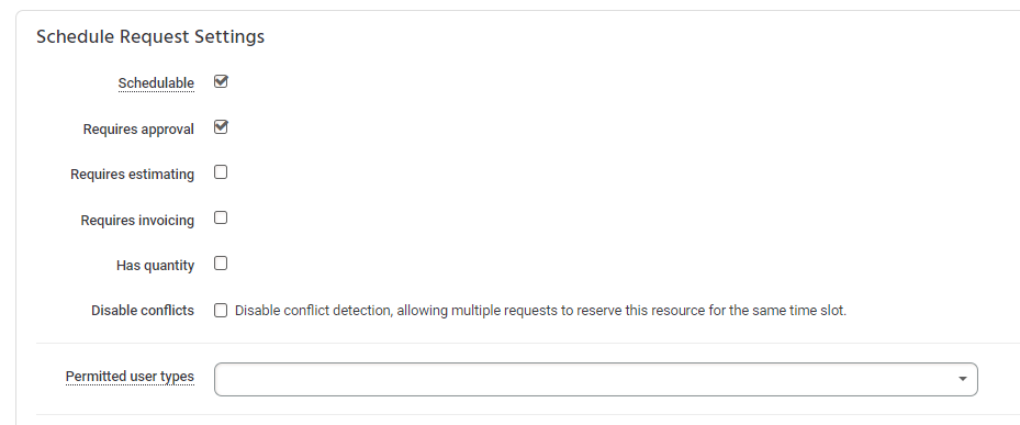 Scroll down to "Schedule Request Settings" and indicate that this is Schedulable, and check Requires approval, estimating, invoicing, has quantity, or choose permitted user types as needed. Save to confirm.