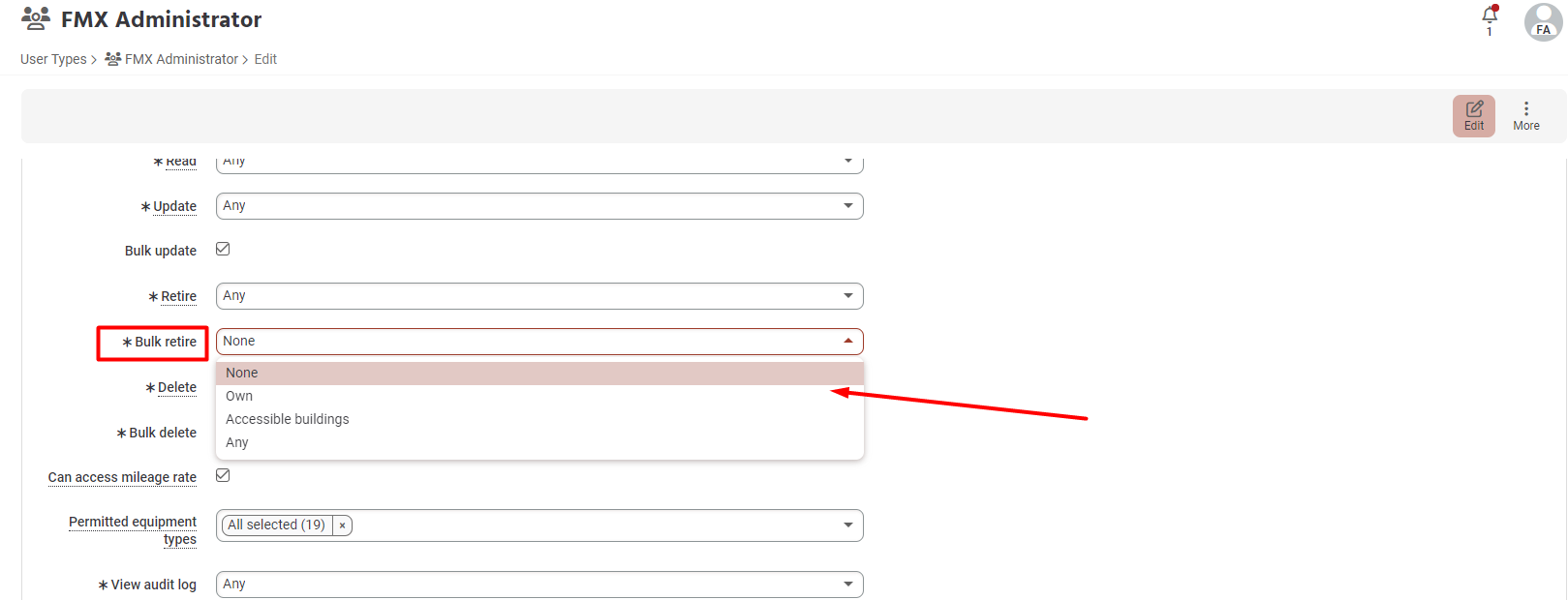 Next navigate to the "Equipment Access" portion of your user type settings and expand the menu. Scroll down to the “Bulk retire” permission and select either "Own", "Accessible Buildings", or "Any" to turn on the feature. Once you have selected the option you would like then go to the bottom of the settings and select "Save".