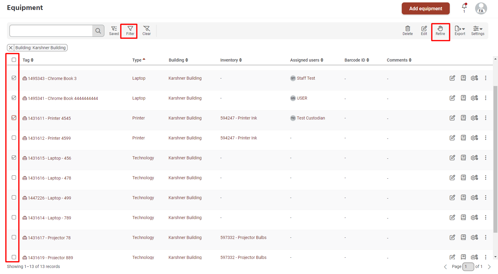 After you turn on this feature go to the equipment grid. Select the check boxes of the equipment items you would like to retire. Use the filter at the top to narrow down what is displayed. To select all the equipment items that are currently displayed select the check box that is above the top equipment item displayed. Once you have chosen what you would like to retire select the "Retire" button.