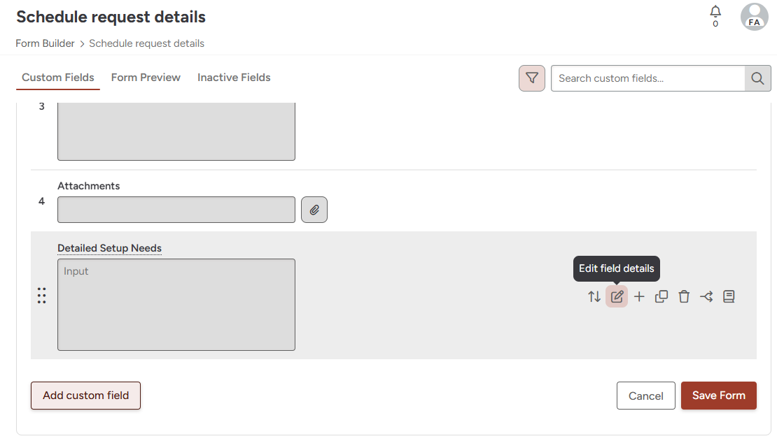 3. To add a tooltip: create a new field by selecting the "Add custom field" button at the bottom of the page, or edit an existing field by selecting the edit icon.