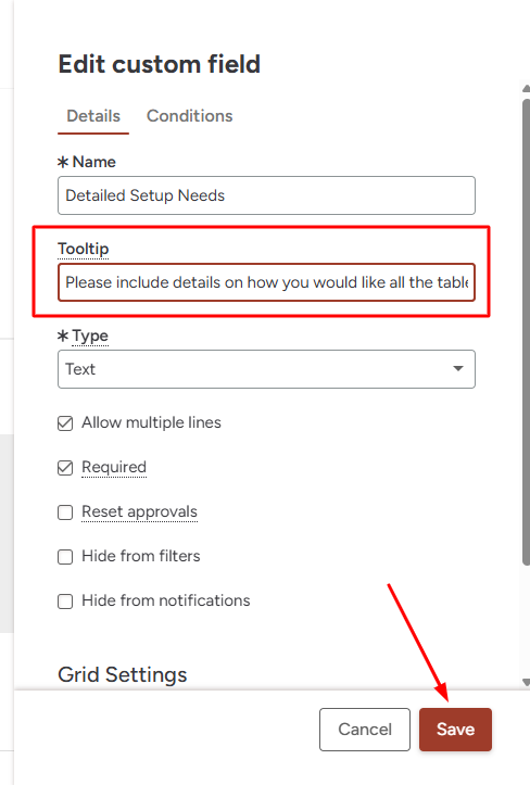 4. Fill out the "Tooltip" field with the message you would like to appear when a user hovers over the name of the field. Click save on the custom field slide-out once you are finished.