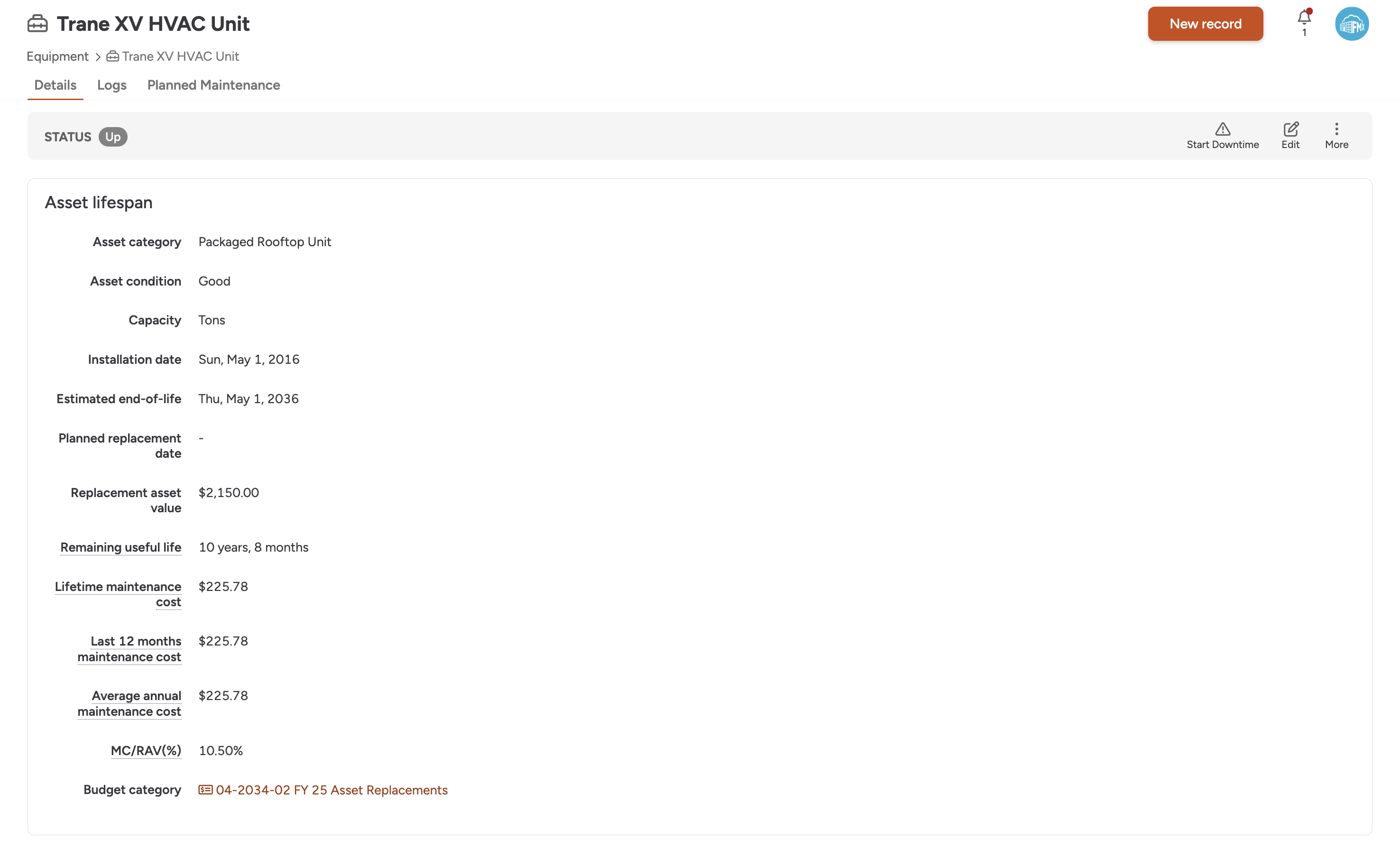 - Lifetime maintenance costs: calculated by summarizing all costs associated with this equipment item (logs, requests, tasks, labor cost, inventory cost, etc.)