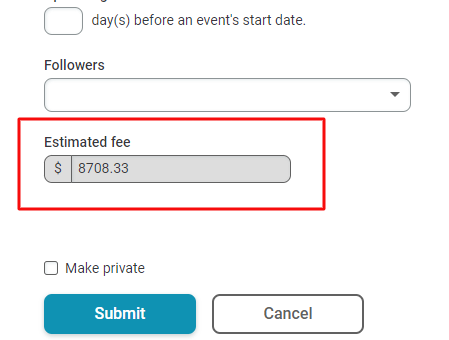 Once these have been set up in your site, Users will be able to see the estimated fee, based on their User Type, prior to submitting their Request. Please note, if you do not wish for users to see the estimated fee, you can disable this by navigating to their User Type (follow the steps above for navigating to the Scheduling Rate Type) and the permission below Scheduling Rate type is "View Estimated Fees" adjust this to None.