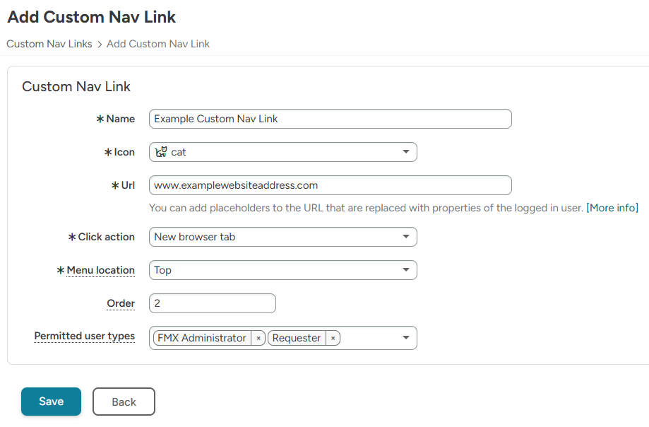 3. Fill in the Name, Icon, URL, Menu location, Order, and Permitted user types. When finished, click Save.