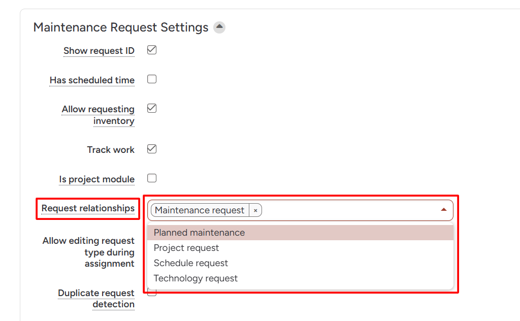 - Example: If you add 'Schedule Requests' into the 'Maintenance Request Settings' 'Request Associations', then it will be available for both of these modules. This will also work the other way around, where if 'Maintenance Request' is placed in the 'Schedule Request Settings' 'Request Associations', it will apply to both modules.