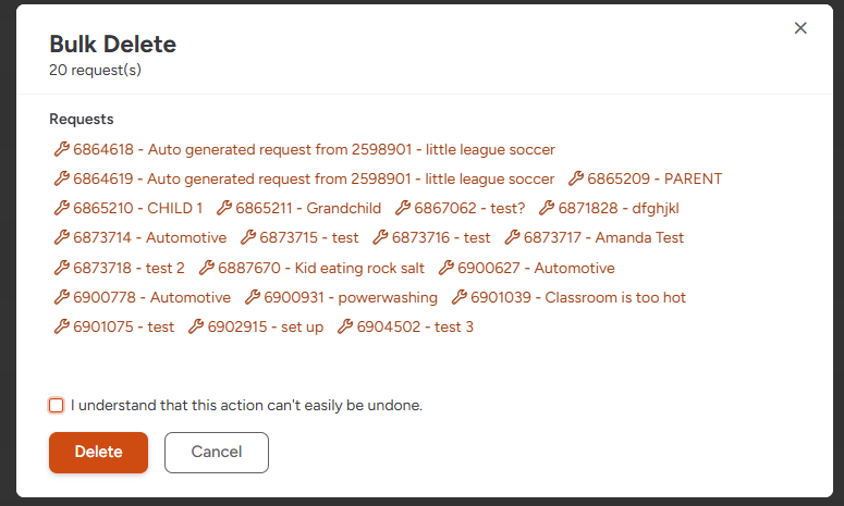 We've added the ability to bulk delete work requests within FMX. This allows excess requests to be deleted quickly, and with fewer clicks, rather than deleting each one individually.