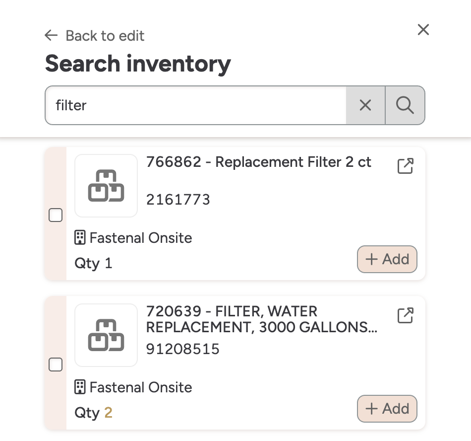 All parts from your local Fastenal Onsite location automatically appear in FMX as a comprehensive, dynamic catalog displaying current quantities (updated daily).