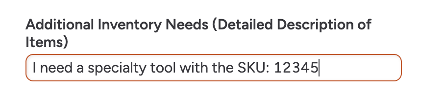 - This custom field will be a free form text field where team members can add general or specialty needs not currently stored in the Fastenal catalogue.