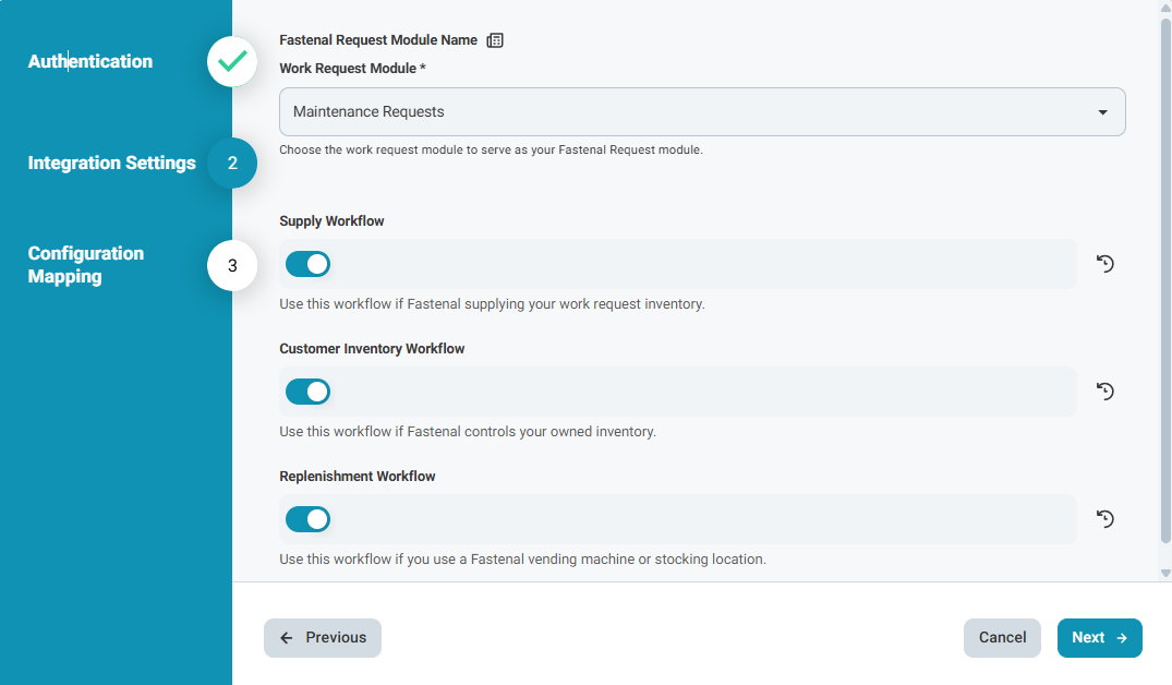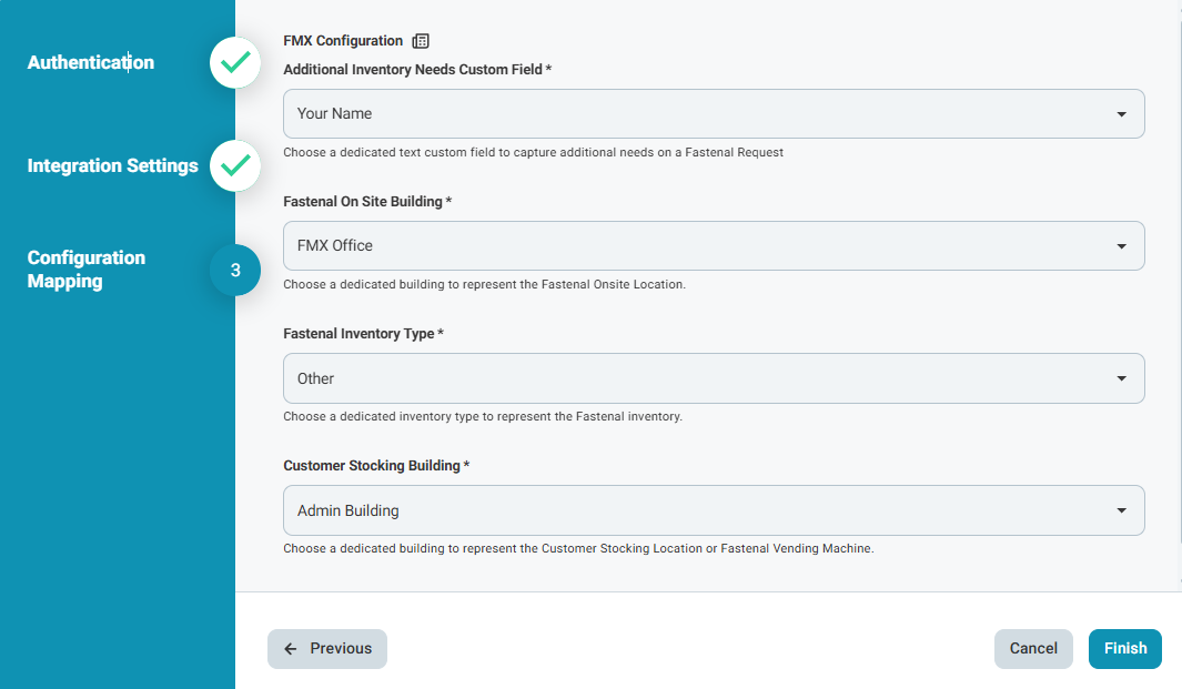 Navigate to Admin Settings > Integrations > Fastenal and select "Configure" or "Reconfigure," then complete each step as detailed below: