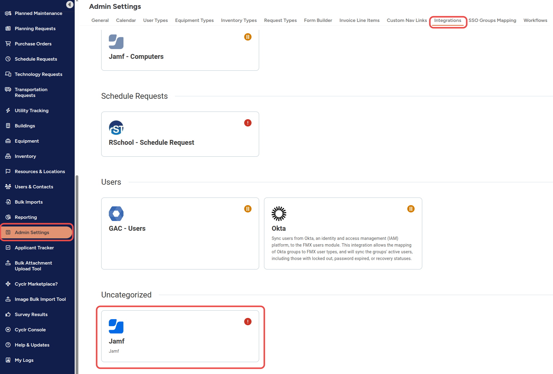 - In FMX, navigate to Admin Settings → Integrations, select Jamf.