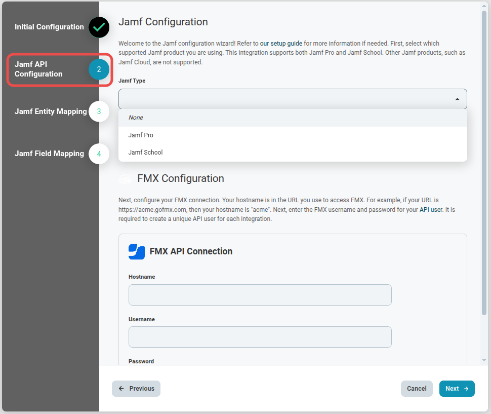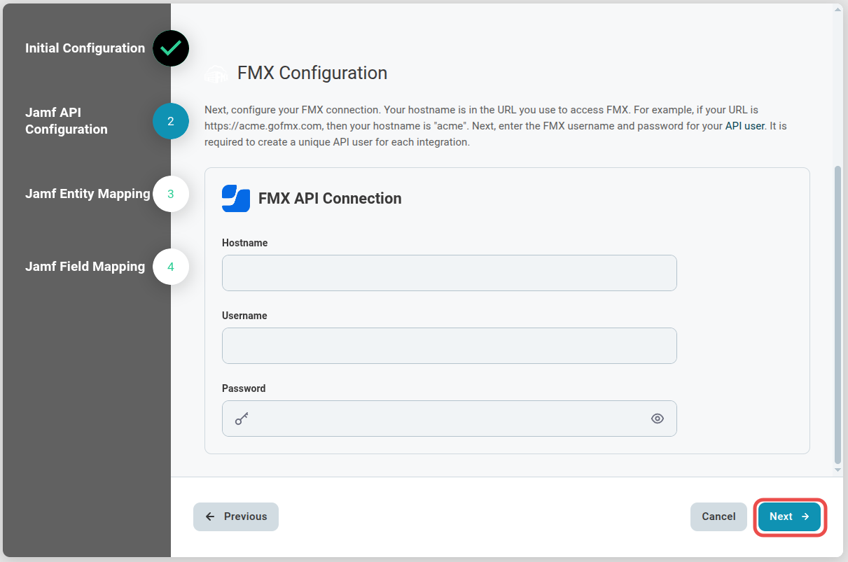 jamfsyncer@gofmx.com) - Password — password for the FMX integration user