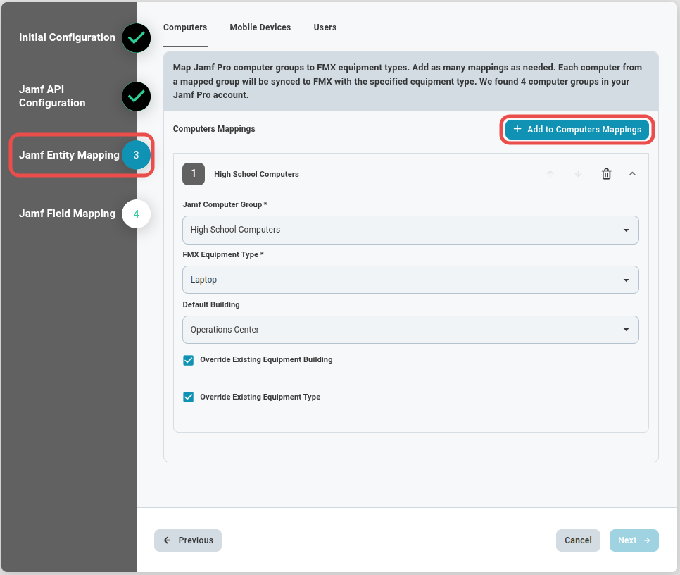 - Create an equipment type in FMX for each Jamf computer/mobile smart group you want to sync