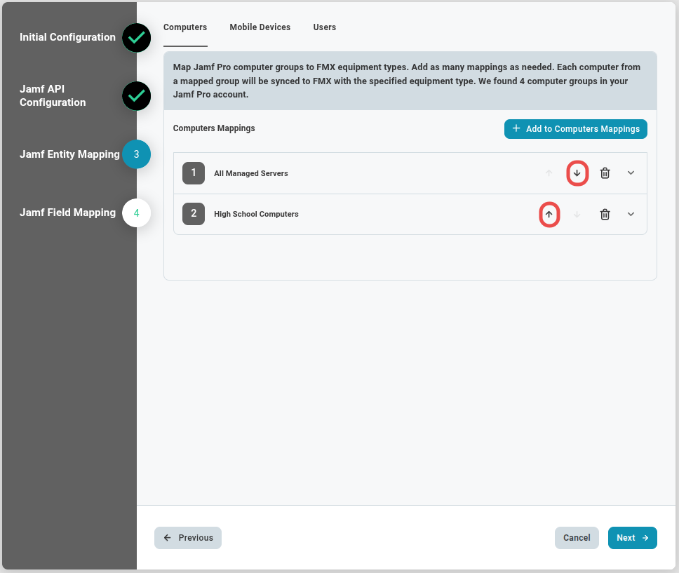 Jamf Computer Group defines which group in Jamf this mapping should apply to. Mappings are applied from top to bottom. If you have Jamf devices belonging to multiple groups, it is generally recommended to put the broadest Jamf groups at the top and more specific groups at the bottom so that mappings are properly applied. Mappings can be moved up or down using the arrows next to the Trash icon. (See screenshot below)