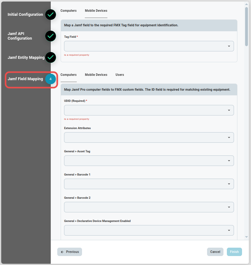 The Jamf Field Mapping page defines which fields from Jamf should be mapped to which custom fields in FMX. Most are not required, though a few are: