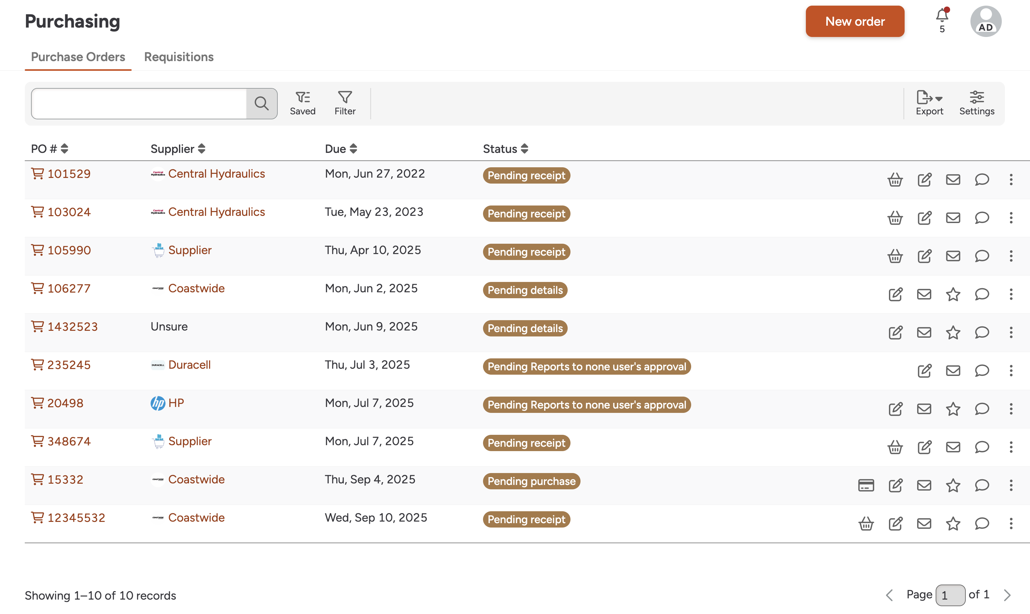 The Purchasing module is organized into two primary tabs: Purchase Orders and Requisitions. Understanding the distinction between these two is fundamental to using the module correctly.