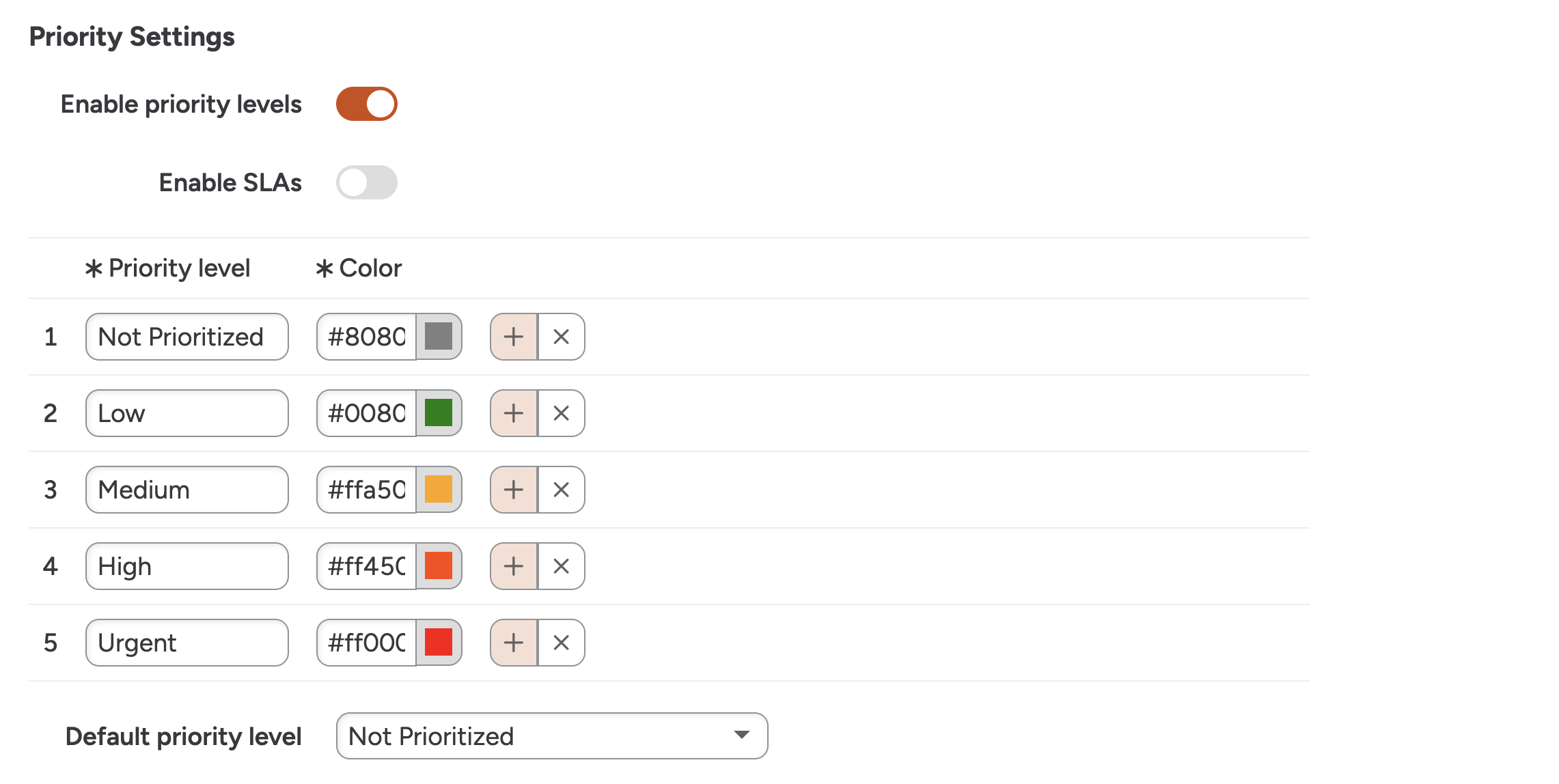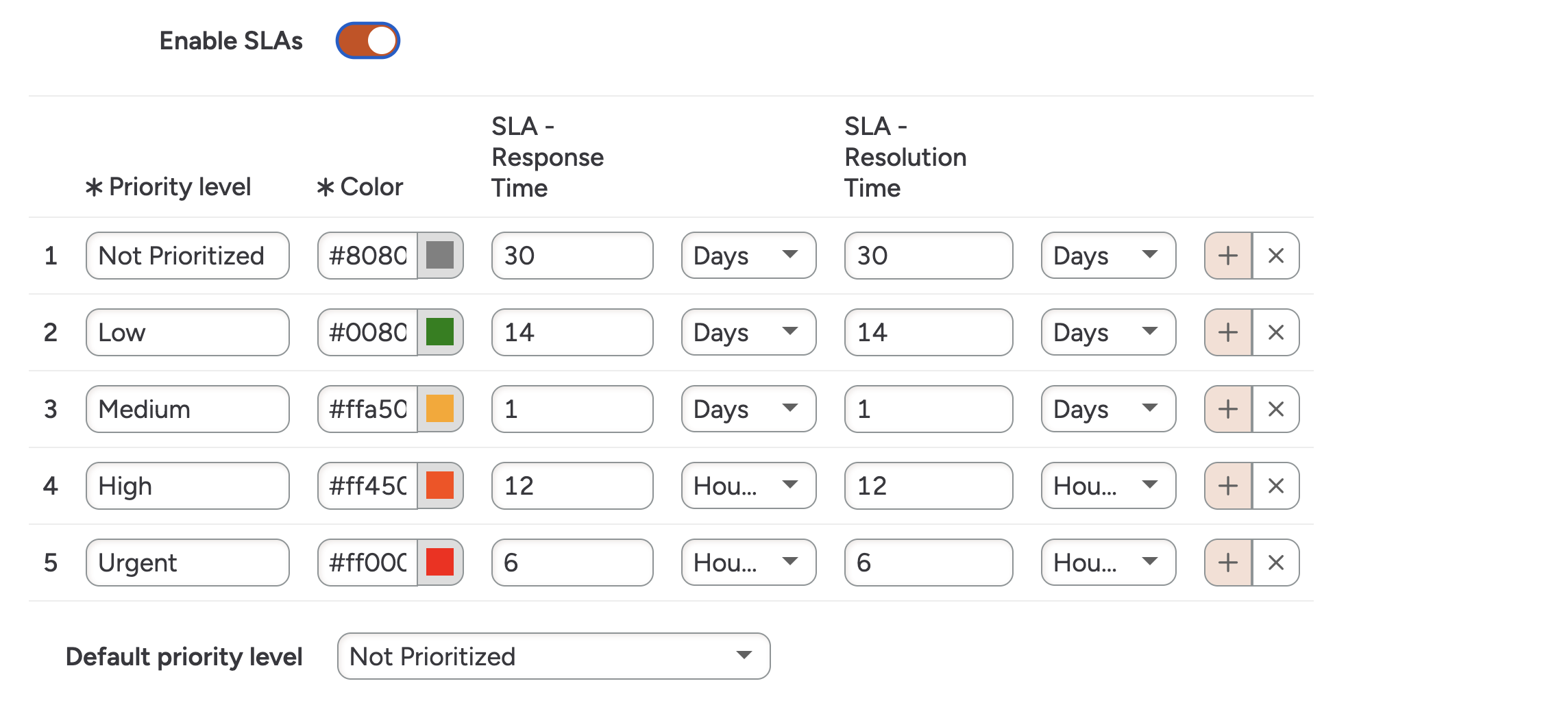 Work Prioritization settings let your organization define Priority Levels for work and (optionally) use Service Level Agreements (SLAs) to track response and resolution expectations.Use Priority Levels on their own, or add SLAs to specific priorities when you want time-based targets.Turn On Prioritization SettingsGo to Admin Settings.Open the General tab.Turn on Priority Settings.Priority LevelsPriority Levels help your team categorize work by urgency or importance. You can also assign a color to each priority level.Assign Priority LevelsYou can assign Priority Levels either on an individual request, or in bulk.Assign On An Individual RequestYou can set or change a request’s Priority Level from:The grid view or all work request and work task modules.The work list grid and board view.Bulk Assign In Grid ViewBulk assignment is available in grid views for supported work modules.Before you start: Bulk assignment options only appear if your user type has access.Go to Admin Settings → User Types.Select the user type you want to update.Ensure the ability to “Bulk assign” is enabled for that user type.Bulk assign steps:In the grid view of the relevant work module, select the requests you want to update using the checkboxes on the left side of the grid.Select Assign.Choose Priority Level.Select the priority level you want to apply.Note: At this time, there is not a dedicated setting to control who can set priority levels.Service Level AgreementsAfter Priority Levels are enabled, SLAs are configured as their own setting.SLAs are optional per priority level. This means you can choose which priority levels have SLA targets and which do not.SLA Targets Per Priority LevelFor each priority level where SLAs are enabled, you can configure SLA targets such as:Response time: The time you expect from creation to the first action on the request.Resolution time: The time you expect from creation to when the request is resolved.SLA Access By User TypeSLA information can be limited based on User Type settings. Navigate to Admin Settings > User Types > Edit and look for the "SLA access" setting in the first User Type section.No access hides all SLA details.SLA access per ticket shows SLA metrics on each individual request (see below).Full access to SLA dashboard shows SLA metrics on each request and on the metrics dashboard (see below).NOTE: SLA access per tickeet applies to all request the user can view. If a user can open a request, and their user type includes SLA access, they can see the SLA information on that request.Per Ticket SLAsUsers with Per Ticket or Full SLA access can see SLA information directly on the top of individual requests.These metrics indicate when the first response should be made and was actually made, as well as when the request should be resolved and was resolved according to your set SLAs.SLA Metrics DashboardThe Metrics view in Work List provides an SLA dashboard experience based on the current Work List search and filters.The Metrics view includes SLA and workload reporting such as:Total tickets by priority levelWorker hours by priority levelSLA compliance by priority for:Response timeResolution timeAverage response time by priority (compared to the SLA target)Average resolution time by priority (compared to the SLA target)Overall SLA compliance rollups for:Response timeResolution time Was this article helpful? 0 out of 0 found this helpful
