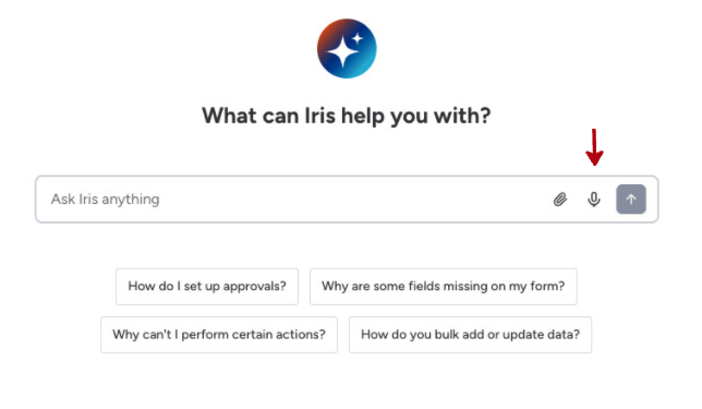 Understanding How Iris WorksIris is an AI assistant powered by a Large Language Model (LLM) integrated with specific FMX actions. Unlike standard software, Iris uses predictive technology to translate your natural language questions into software commands and then translates the software's data back into easy-to-understand responses.Because Iris relies on predictions rather than "thinking," you may notice the following:Variability: Iris might provide slightly different responses to the same question asked at different times.Contextual Knowledge: To improve accuracy, Iris is provided with FMX-specific context and information regarding your organization.Safety Blocks: Iris is designed to block requests unrelated to its purpose. If it is unsure how to answer a support-related question, it will direct you to the FMX support team.✅ Best Practice: Because Iris uses predictive technology to fulfill your requests, it is always a good idea to perform a quick review of the details—especially when performing bulk actions—to ensure the results match your expectations. Iris PermissionsAll organizations and user types have access to Iris by default; however, you have full control over these permissions. You can disable Iris for your organization by unchecking the "Enable Iris" option in your General Settings with Admin Settings. You can disable Iris for specific user types by visiting the Iris Access Settings within the User Type Settings and unchecking the "Can access Iris" option.Navigating IrisEasily engage Iris by typing directly into the text field or choose from our suggested prompts to start exploring.Voice-to-TextDictate directly to Iris by clicking the microphone button in the text field. You will be required to grant Iris permissions access your microphone the first time you use this. Iris will automatically process your message once it detects you have stopped speaking.Start a New ChatCreate a new chat by clicking the + sign in the upper left corner.Chat HistoryClick the toggle sidebar button to view your chat history. Select any previous chat to review conversation details. Reviewing Iris capabilitiesIris allows you to retrieve information and perform actions on your Work Requests without navigating through multiple menus.Product SupportYou can ask Iris questions about your FMX products, including:Product Functionality: Ask how you can use certain features and products.Trouble shooting: Ask why features or products are not working as expected.Information retrievalYou can ask Iris to find and display specific data points, including:Work Request Search: Search for requests based on keywords.Asset Tracking: Search for and display specific Buildings and Equipment items.Dynamic Visualization: Iris automatically adjusts column headers based on your input and can visually break down lists of requests into organized tables.Request actionsIris can perform actions on single requests or execute bulk actions across multiple requests. When performing bulk actions you will have the option to Apply All or Review individual requests. Action TypeSupported ActionsSingle RequestAssign, Re-assign, Place on hold, Take off hold, and Respond.Bulk ActionAssign, Place on hold, Take off hold, Respond, and Resolve. Using Iris effectivelyTo get the most accurate predictions from Iris, follow these best practices:Provide detail: Give as much information as possible in your initial question.Stay focused: Avoid "context-switching" or jumping between unrelated topics in a single conversation. When you have an unrelated question, open a new chat. Search by supported fields: For the best results, use the following fields when searching for Work Requests:Work Request ID or Name/TitleStatus, Due Date, or Creation/Resolution DateAssigned User(s) or RequesterBuilding Name, Location, or Equipment ItemRequest Type Identifying limitations and prerequisitesAs an early-access feature, there are specific scenarios where Iris may not function as expected:Supported Modules & User Types: Iris functionality is currently focused on the Work Request module. Full functionality is currently limited to FMX Admins; non-admin users may encounter errors during this early access phase.Formula Fields: If your Assign, Hold, Respond, or Resolution forms contain formula fields, Iris actions will not work for your organization.Bulk Assignment: When assigning multiple requests at once, Iris currently only supports even distribution across all eligible technicians. You cannot yet bulk-assign a specific set of requests (e.g., all requests for a specific building) to one specific individual.Unsupported Search Criteria: You cannot currently search by Building Group, Priority Level, "On behalf of" user, or specific completion/assignment dates. Was this article helpful? 0 out of 0 found this helpful