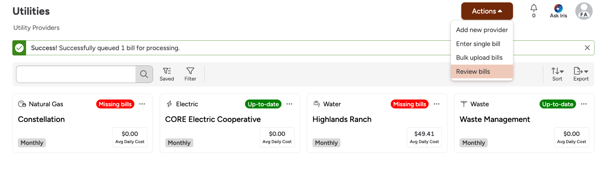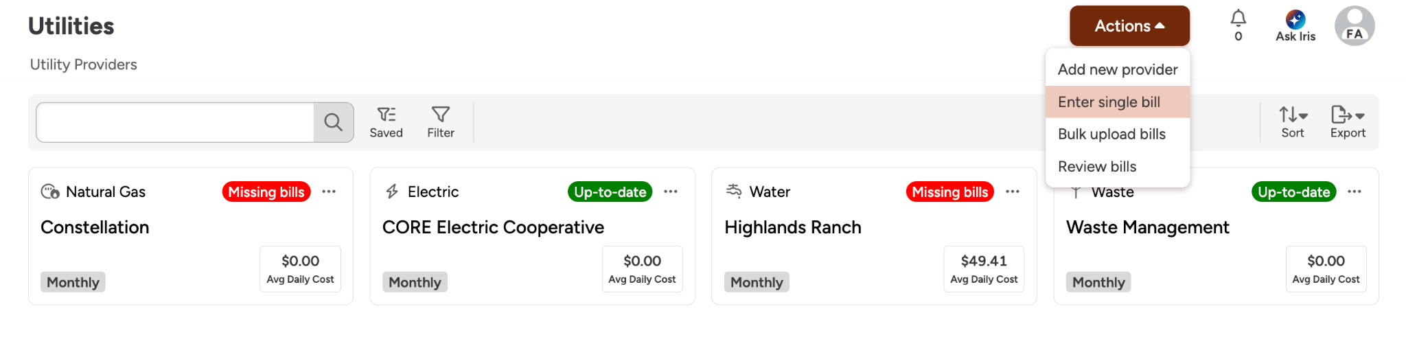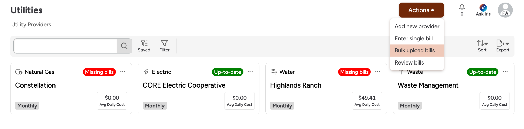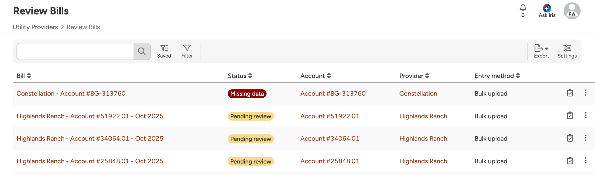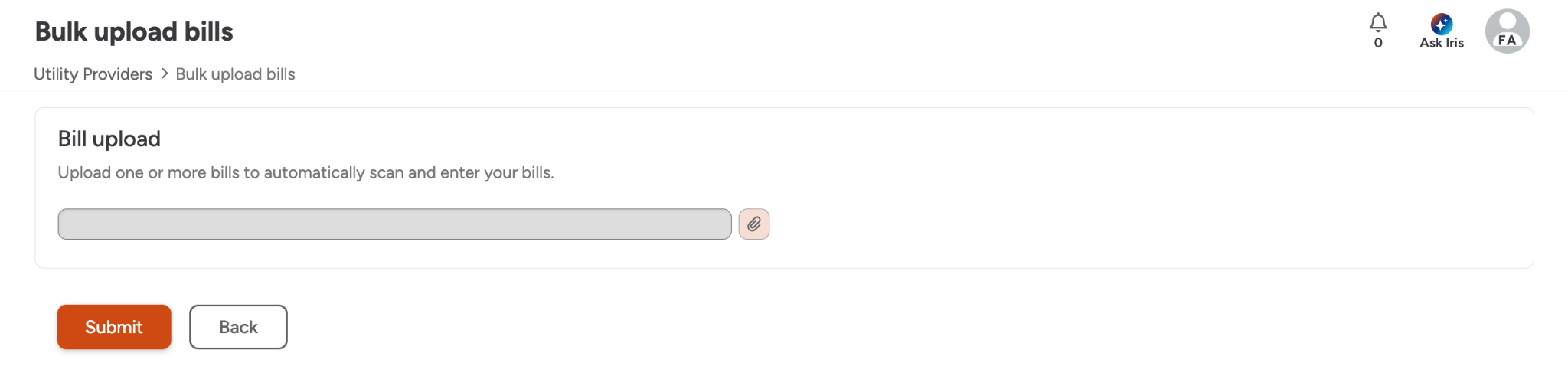 FMX offers several options for entering bill data to accommodate both historical records and ongoing invoices.Single Bill EntryManually submit and review a single bill for immediate updates. When entering a single bill, you can opt to upload a pdf of the bill and have FMX’s AI-Powered data extraction provide suggested field entries. These suggestions can be approved in bulk by clicking approve all or individually by clicking the suggestion under the field. Bulk Import (Excel)Navigate to the Bulk Imports section and use FMX spreadsheet templates to migrate large volumes of historical utility data at once. Bulk UploadUpload files in batches to have the system scan and process them, with the ability to review the results afterwards.First, select Bulk upload billsUpload your pdfOnce you have uploaded your pdf, you should see a success banner on your screen indicating that the batch has begun processing. You will receive an email confirmation once the pdf has been processed. Once processed, you can review the created bills and make any necessary updates. Understanding FMX AI-powered Data ExtractionFMX Utility Manager employs an AI-driven scanner to automatically extract data from your invoices, reducing manual entry errors.PDF Upload: Upload PDF utility bills directly to the platform. You will receive an email after each bulk upload with information on your upload status.Email Forwarding: Set up automated bill ingestion by forwarding billing emails to FMX. When forwarding emails, use the email provided in the admin settings. It will look like "bills@hostname.gofmx.com"Refining Accuracy: You can add Provider-specific instructions to the AI to improve the accuracy of its suggestions and field population. We also suggest starting off single bill uploads to test accuracy and fine-tune instructions before moving to bulk upload or email forwarding. Understanding Your BillUtilities uses bill workflow states to help you track what still needs attention. You may see concepts such as:Entered: A bill that was manually entered, or a bill that has already been reviewed and accepted.Pending review: A bill uploaded via email forwarding or bulk upload that has all required information, but is waiting for human approval.Missing data: A bill uploaded via email forwarding or bulk upload that is missing one or more required fields, including required custom fields.By default FMX will track the following fields for Utilities bills, but you can always add additional custom fieldsGeneral bill infoUtility Provider: Which provider the bill is for (selected on the bill).Utility Account: Which account number the bill is for (selected on the bill).Bill cycle: A single “bucket” date used to place the bill into the correct period based on the provider’s billing frequency (Monthly, Quarterly, Yearly). This field is not visible for providers on an Other interval.Bill start date: Start of the service period for the bill.Bill end date: End of the service period for the bill.Meter consumption & demand (only shown when you have meters configured)Meter consumption: Consumption values per meter (only when tracking consumption and splitting by meter).Meter demand: Demand values per meter (only when tracking demand and splitting by meter).General bill chargesTotal bill amount: Total cost for the bill Consumption total: Total consumption for the bill (in the provider’s configured unit), if consumption tracking is enabledConsumption charge: Portion of cost attributed to consumption, if enabledDemand total: Total demand for the bill (in the provider’s configured unit), if demand tracking is enabledDemand charge: Portion of cost attributed to demand, if enabledLate fee charge: Late fee amountTax charge: Tax amountOther charge: Catch-all “other” chargesAs you enter values, FMX automatically calculates common derived fields such as:Billing daysAverage daily costAverage daily consumptionUnit cost (for example, consumption charge divided by consumption total) Was this article helpful? 0 out of 0 found this helpful