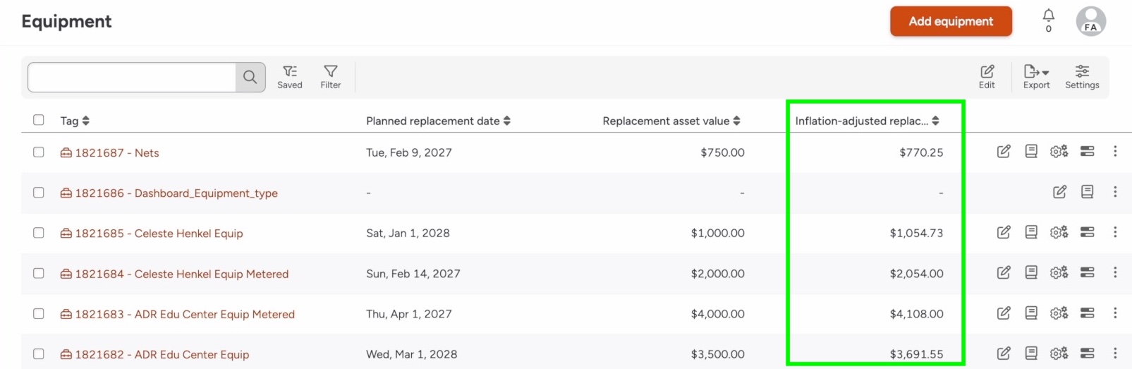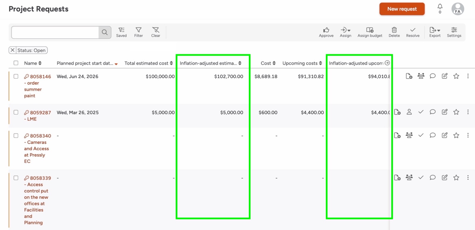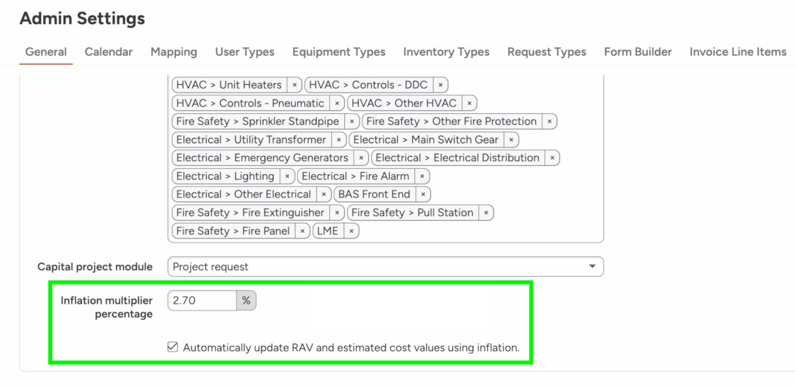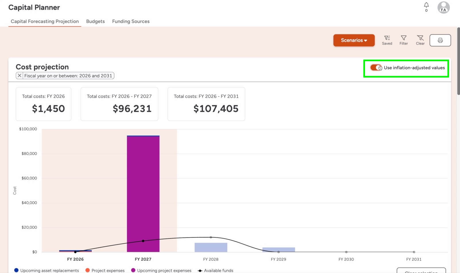 Learn how to enable inflation projections in Capital Planner and how inflation-adjusted values are calculated and displayed across equipment, projects, dashboards, and budgets.How it WorksInflation Projections lets your organization apply a single inflation rate to future equipment and project costs in Capital Planner.When enabled, FMX keeps your original values in today’s dollars and also calculates inflation-adjusted values for future fiscal years.Key Concepts Inflation multiplier percentageThe annual inflation rate your organization sets (for example, 2.7%). Base values are in today’s dollarsInflation-adjusted calculations assume the values you enter today are current, for example: Equipment Replacement asset value (RAV) Project Estimated cost CompoundingInflation compounds year over year. Inflation-Adjusted CalculationFMX applies the inflation multiplier percentage once per fiscal year between today and the planned date.Inflation-Adjusted Value = Today’s Value × (1 + Inflation multiplier)^(number of fiscal years)Note: The number of fiscal years is determined using your organization’s Fiscal year start date.ExampleThis example uses a fiscal year start date of 06/01. Today: 03/10/2026 Fiscal year start date: 06/01 Inflation multiplier percentage: 2.7% Today’s value: $2,000 Planned date: 07/15/2027 Because there are 2 fiscal years between 03/10/2026 and 07/15/2027, FMX applies inflation 2 times.Inflation-adjusted value = $2,000 × (1.027)^2 = $2,109.46Before You Begin Capital Planner must be enabled and configured. See Capital Planner Setup Guide. For the most accurate projections, make sure these fields are filled out and kept current: Equipment: Planned replacement date and Replacement asset value (RAV) Projects: Planned project start date and cost fields If you are funding work using Accounting budgets, review Using Budgets with Capital Planner. Enabling Inflation Projections Navigate to Admin settings. Open Capital Planner settings. Find the inflation settings. Enter your organization’s Inflation multiplier percentage (for example, 2.7%). Optional: Enable Automatically update RAV and estimated cost values using inflation.This setting is explained later in Optional: Annual Updates. Click Save. Fiscal Year Start DateInflation calculations and annual updates use your organization’s Fiscal year start date.To review or update this date, go to Admin settings → General settings → Fiscal year start date.How Inflation Affects EquipmentWhen inflation is enabled, FMX calculates inflation-adjusted values for equipment.What It CalculatesInflation-adjusted RAVWhat It Uses Equipment Replacement asset value (RAV) Equipment Planned replacement date The global Inflation multiplier Your organization’s Fiscal year start date Note: Inflation uses the planned replacement date. It does not use estimated end-of-life because inflation should reflect when you plan to replace the asset.Where You’ll See It On the equipment record In the equipment grid In Capital Planner grids and dashboards when using inflation-adjusted values How Inflation Affects Capital ProjectsWhen inflation is enabled, FMX calculates inflation-adjusted values for capital projects.What It Calculates Inflation-adjusted total estimated cost Inflation-adjusted upcoming cost What It Uses The project’s Planned project start date The project’s base cost fields, including any subrequest estimates, which roll up into total estimated cost Understanding Upcoming CostProjects track both what you planned to spend and what you have already spent. Total estimated cost is the full planned budget for the project. Upcoming cost is what is left to spend after subtracting actual spend to date. ExampleThis example uses a fiscal year start date of 06/01 and an inflation multiplier percentage of 2.7%. Total estimated cost: $50,000 Actual spend to date: $12,000 Upcoming cost in today’s dollars: $38,000 Planned project start date: 08/15/2027 Because there are 2 fiscal years between today and 08/15/2027, FMX applies inflation 2 times.Inflation-adjusted upcoming cost = $38,000 × (1.027)^2 = $40,079.68Where You’ll See It On the project or work request record In the Capital Planner project grid In Capital Planner grids and dashboards when using inflation-adjusted values How Inflation Affects Capital PlannerAfter you have equipment and capital projects in the system, Capital Planner can display either today’s dollars or inflation-adjusted values. Use the Use inflation-adjusted values toggle to switch between them.What Changes When You Toggle It OnWhen inflation-adjusted values are enabled, Capital Planner uses: Inflation-adjusted RAV for upcoming asset replacements Inflation-adjusted upcoming cost for upcoming project expenses This impacts: The cost projection chart The supporting grids Any other dashboards within Capital Planner How Inflation Affects BudgetsIf you are using budgets with Capital Planner, inflation adds inflation-adjusted budget calculations alongside the existing values.Budgets include: Inflation-Adjusted Upcoming AmountThe budget’s upcoming amount calculated using inflation-adjusted values for assigned items, including equipment replacement costs and project costs. Inflation-Adjusted Available BalanceThe budget’s available balance calculated using the inflation-adjusted upcoming amount instead of the non-inflation-adjusted upcoming amount. ExampleIf a budget has $10,000 in upcoming work (today’s dollars) and inflation-adjusted upcoming work of $10,800, you will see two different available balances: Available Balance uses $10,000. Inflation-Adjusted Available Balance uses $10,800. To learn more about creating and managing budgets, see Budget Set-up (Accounting).Optional: Annual UpdatesAnnual updates determine whether FMX updates your base values for you each fiscal year.This is important because inflation-adjusted calculations assume base values are in today’s dollars. If base values are not kept current, infl