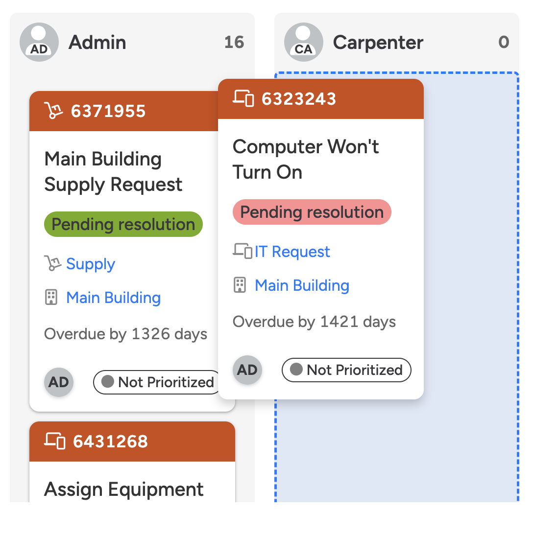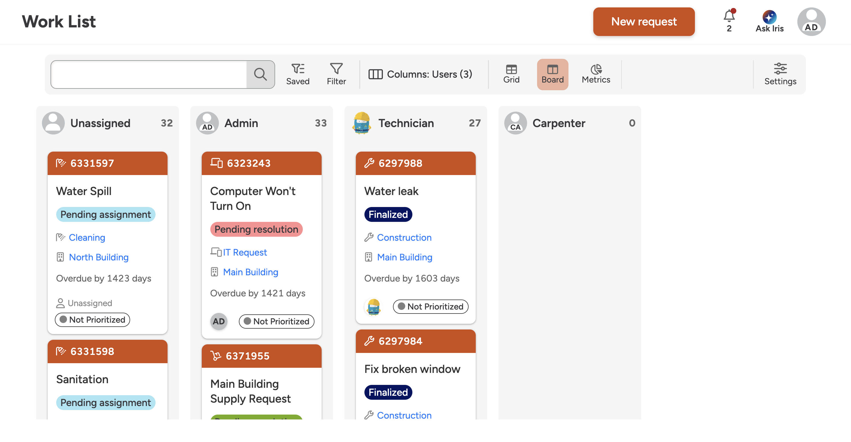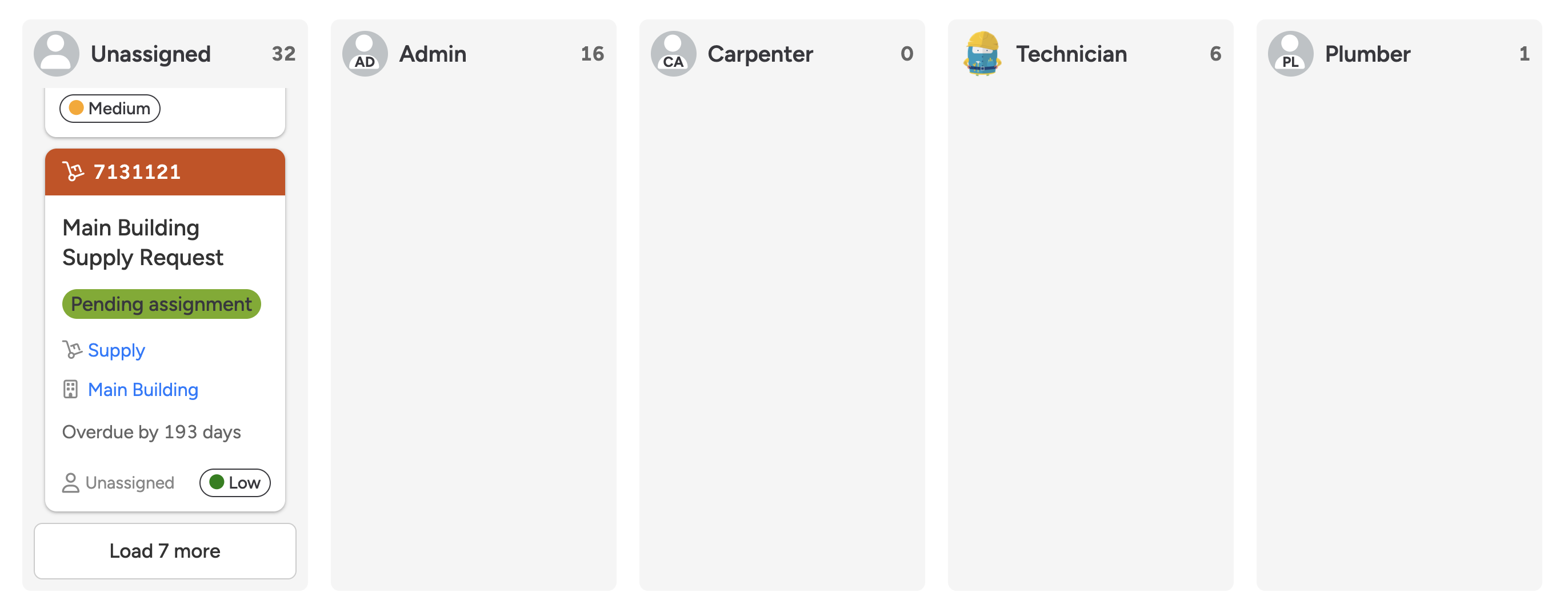 The Work List Board View is a drag-and-drop interface for managing your team’s workload within the Work List module.Use Board View to run daily maintenance huddles, see what is unassigned, and rebalance work across technicians without living in spreadsheets.Before You StartTo use the Board View, your user type must have Work List access. Navigate to Admin Settings. Select User Types. Select Edit for the intended user type. Under Work List Access, enable Can access work list. If you do not have access to update user types, contact your FMX administrator.Open Board View Navigate to Work List. Select the Board button to switch from grid view to the drag-and-drop board. FMX remembers your last selected view, so when you return later you will land back in the same view.Choose Which Users Appear As ColumnsShow or Hide UnassignedThe Unassigned column can be hidden or shown so you can fit more assigned user columns on screen. Select Columns. Toggle Show Unassigned column on or off. Add or Remove User Columns Select Columns. Under Users, select the users that should appear as columns on the board. Tip: If you select more than 10 total columns (9 if the unassigned column is show), FMX will show a warning and hide additional users.Assign And Reassign WorkAssign From Unassigned Find the work item in the Unassigned column. Click and drag the card into the intended user’s column. Drop the card to assign it. Reassign Between Users Click and drag a card from one user’s column to another. Drop the card to reassign it. Reorder Work Within A User ColumnYou can also reprioritize the order of work within a single user column. Drag a card up or down within the same user’s column. Drop the card to save the new ordering. Open And Edit Card DetailsYou can open details without leaving the board. Select a card to open details in a slide out. In the slideout, select the option to open the work item full screen. Some actions open in a slide out.To open the assignment action, select either the assigned user icon or the priority level icon on the card. This is also where you can edit priority. Priority is only displayed if priority levels are enabled. Loading More CardsThe board may initially load a subset of work items per column.If not all items are loaded yet, use the load more behavior at the bottom of a column to fetch additional cards. Was this article helpful? 0 out of 0 found this helpful